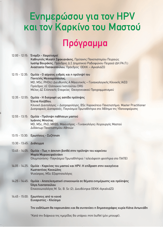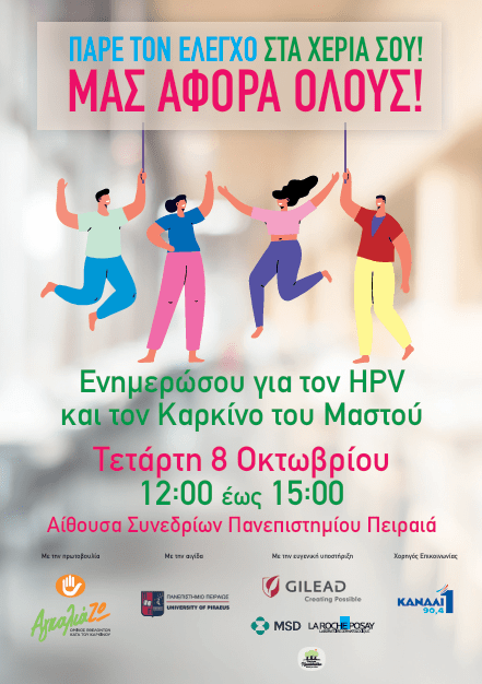 Ο Όμιλος Εθελοντών κατά του Καρκίνου ΑγκαλίαΖΩ σε συνεργασία με το Πανεπιστήμιο Πειραιά και τη Δημοτική Ραδιοφωνία Πειραιά Κανάλι1 πραγματοποίησαν με εξαιρετική επιτυχία, ημερίδα ενημέρωσης και ευαισθητοποίησης για τον καρκίνο του μαστού και το HPV, την Τετάρτη 8 Οκτωβρίου 12.00-15.00 στο Πανεπιστήμιο Πειραιά.