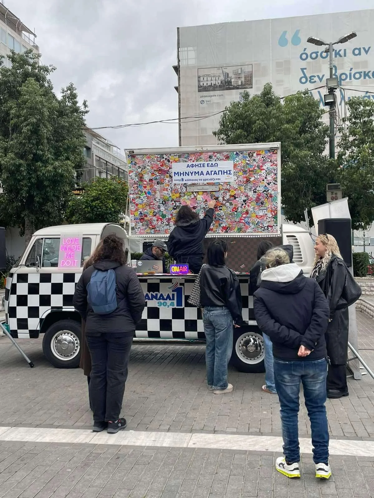 Οι εθελόντριες και οι ραδιοφωνικοί παραγωγοί συζήτησαν, ενημέρωσαν, μοίρασαν έντυπα του ομίλου, αντάλλαξαν σκέψεις και συναισθήματα, έστειλαν μηνύματα αγάπης και γέμισαν τον τοίχο της ενσυναίσθησης με τον δικό τους πολύχρωμο τρόπο από τους διερχόμενους.